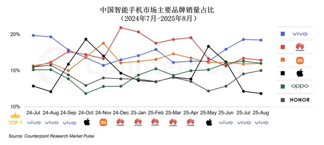 根据Counterpoint Research Market Pulse数据,2024年7月至2025年8月(如上图),中国市场销量排名TOP6的手机厂商竞争格局稳定,共占据约95%的份额。其中,vivo和华为在头部位置上呈现交替领先的竞争态势,苹果虽在个别月份登顶,但其份额较一年前有所下滑。具体来看,华为、vivo和小米位列中国智能手机市场销量前三,占比分别为17.6%、17.6%、16.4%,合计市场份额过半。