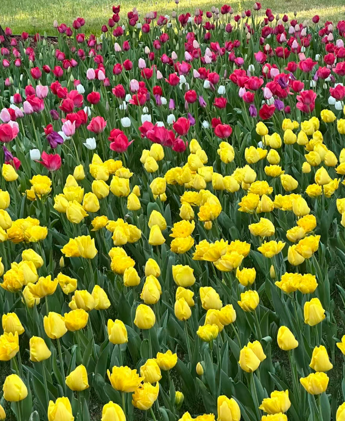 今年,公园有100多个品种、超18万株郁金香沿着4000平方米的花海铺展开。红的似火、黄的如阳、粉的像霞,还有渐变的紫、奶白相间的品种,层层叠叠铺满了脚下的土地。
